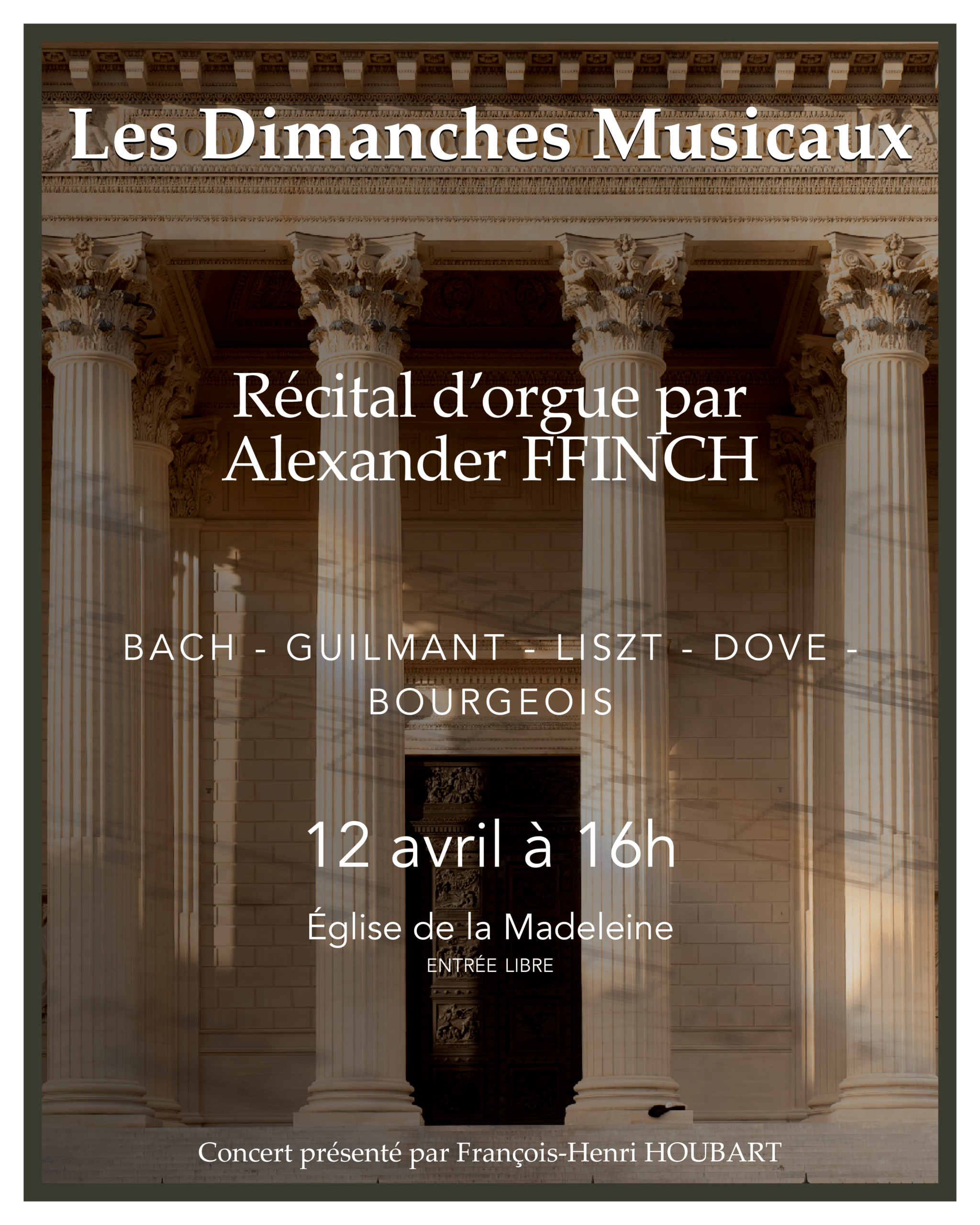 Johann Sebastian BACH (1685-1750)Pièce d’Orgue BWV 572Très Vitement - Gravement - Lentement Alexandre GUILMANT (1837-1911)Marche Funèbre et Chant Séraphique Jonathan DOVE (1957)The Dancing Pipes Derek BOURGEOIS (1941-2017)Sérénade Franz LISZT (1811-1886)Fantaisie et Fugue sur "Ad nos, ad salutarem undam" (extr.)Adagio - Allegro deciso - Fuga Concert présenté par François-Henri HOUBART Alexander Ffinch a étudié au Royal … Lire la suite de« Dimanches Musicaux – Récital d’orgue par Alexander FFINCH (Cheltenham, GB) » |